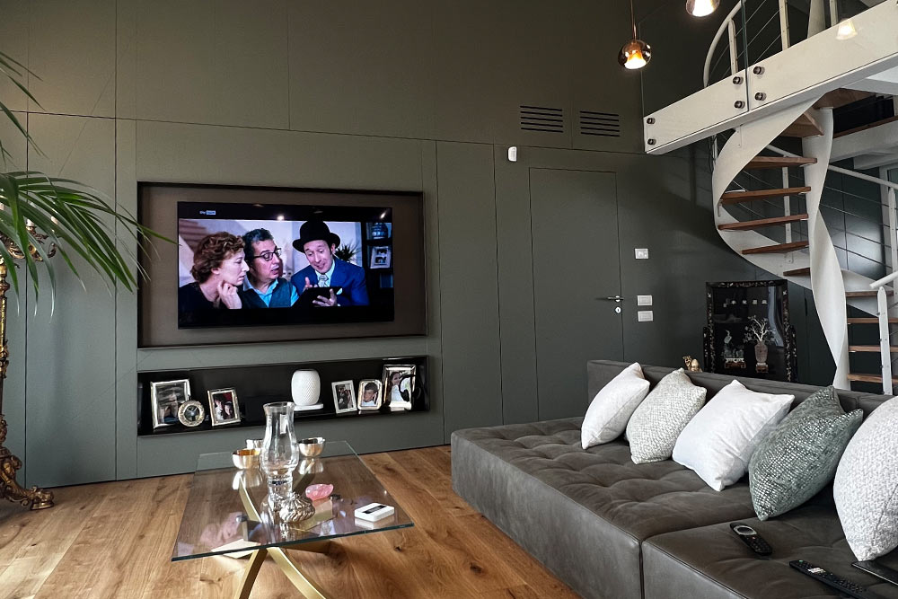 Abbiamo scelto di valorizzare la parete del soggiorno utilizzando la linea Dresscode di Olivieri che oltre a permetterci di sfruttare al centimetro la parete da attrezzare, ha diverse tipologie di boiserie che rendono l’ambiente elegante e accattivante.