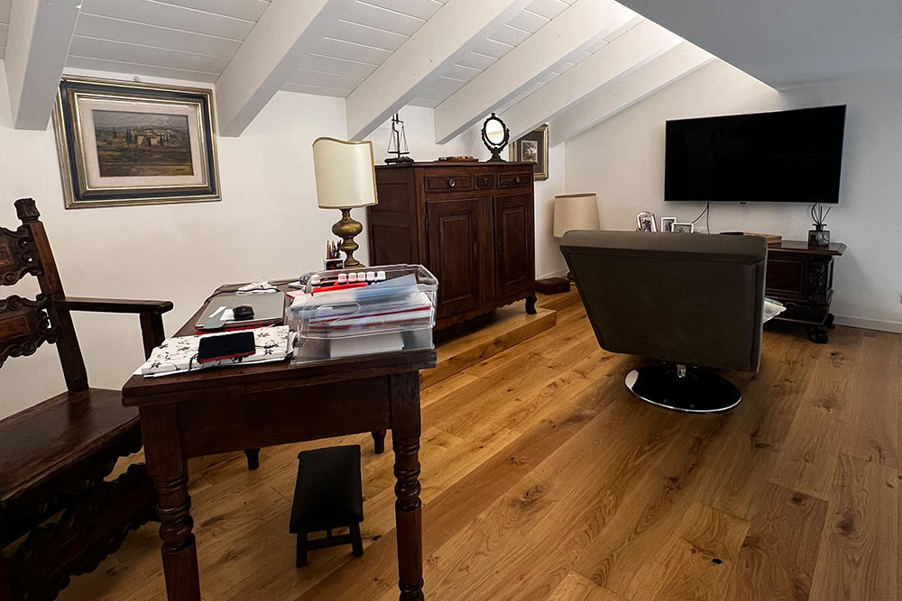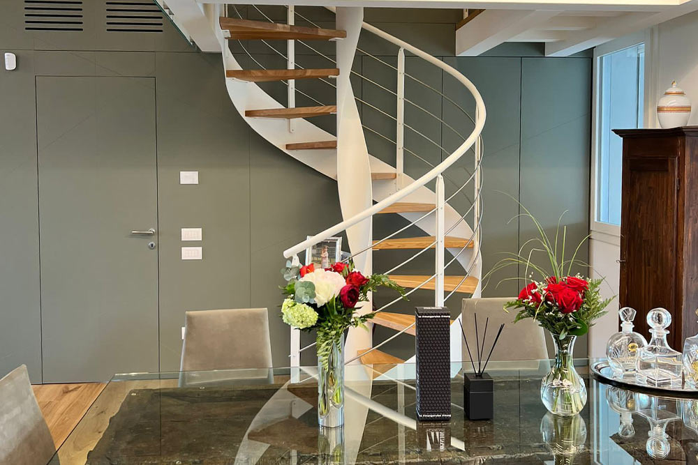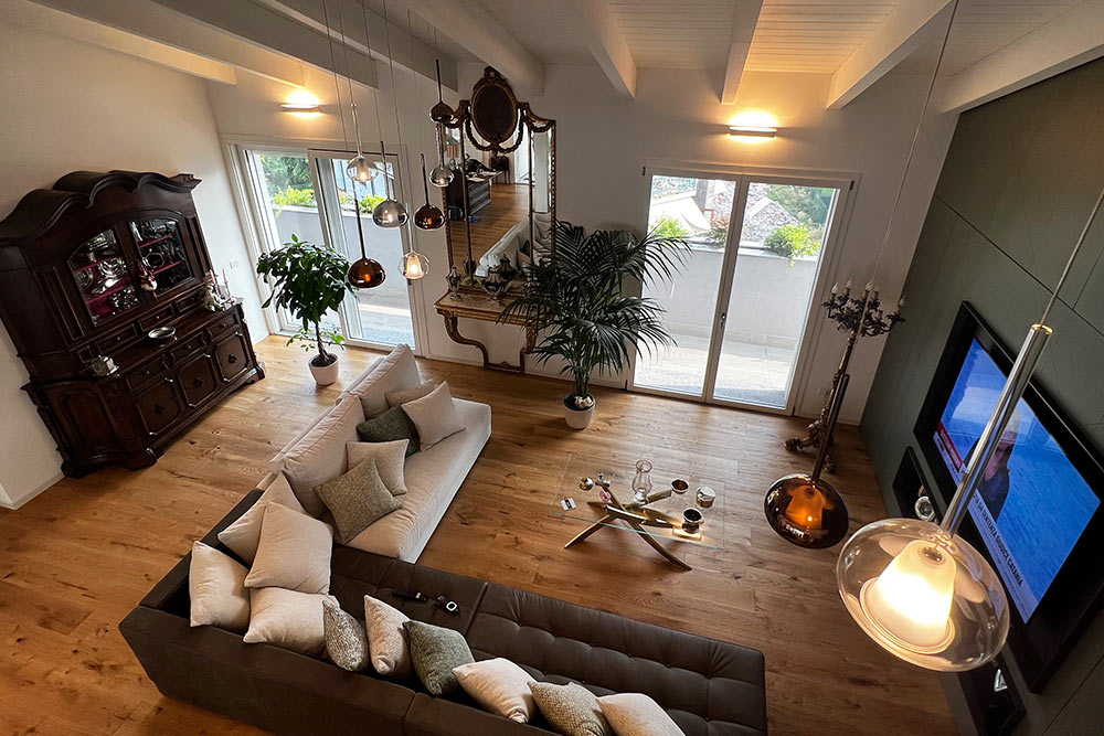 Per la cucina hanno scelto il modello Moka di Pedini in una finitura hybrid con inserti in legno rovere che creano un contrasto di colori davvero interessante e al tempo stesso, grazie anche ai piani in Dekton, creano un ambiente cucina molto elegante. Meraviglioso anche il contrasto tra il tavolo antico dei clienti e le sedie polo di Bontempi Casa.