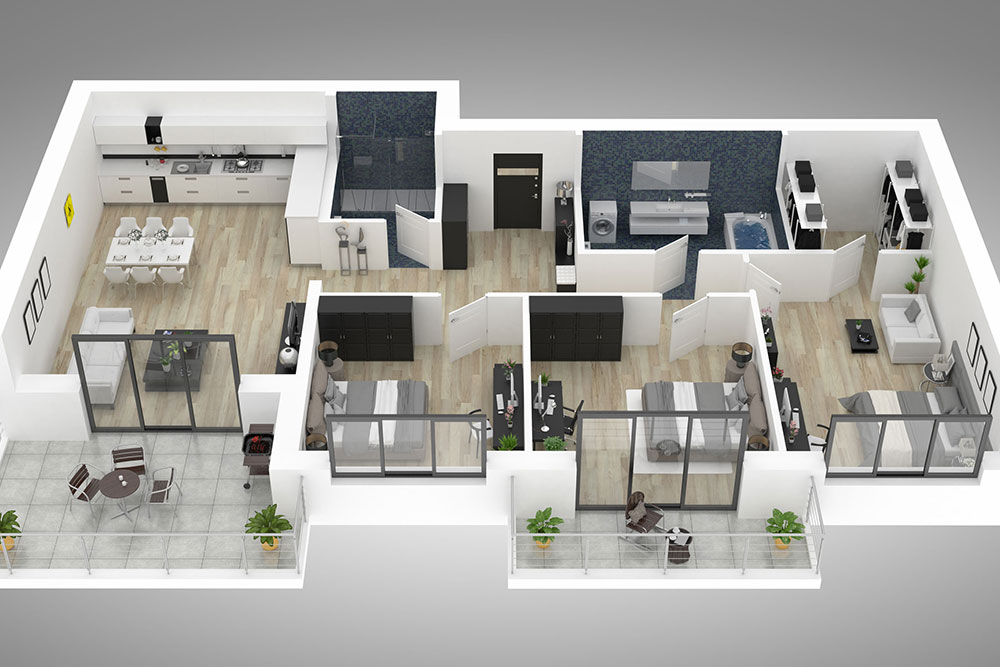Lo sviluppo del progetto verrà poi concretizzato fornendo immagini 3D particolareggiate di ogni ambiente da arredare, scelta dei materiali degli arredi, disegni tecnici degli impianti e preventivo dettagliato.